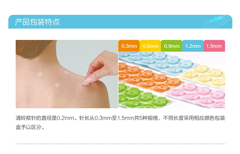 撳針是一種創(chuàng)新型皮內(nèi)針,具有安全,方便,舒適,無創(chuàng)痛等特點。2002年開始研發(fā),2004年正式在日本上市。撳針直徑均為0.2mm。針長從0.3mm至1.5mm共五種規(guī)格。按照日本QMS(醫(yī)療器械生產(chǎn)質(zhì)量管理體系)生產(chǎn)。獲得美國FDA認證,歐洲CE認證,SFDA認證及ISO13485質(zhì)量體系認證。